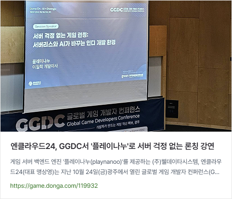 게임 서버 백엔드 엔진 '플레이나누(playnanoo)'를 제공하는 (주)웰데이타시스템, 엔클라우드24(대표 맹상영)는 지난 10월 24일(금)광주에서 열린 글로벌 게임 개발자 컨퍼런스(GGDC)에서 "서버 걱정 없는 게임 런칭(Serverless Game Launch)"을 주제로 발표를 진행했다고 31일 밝혔다.